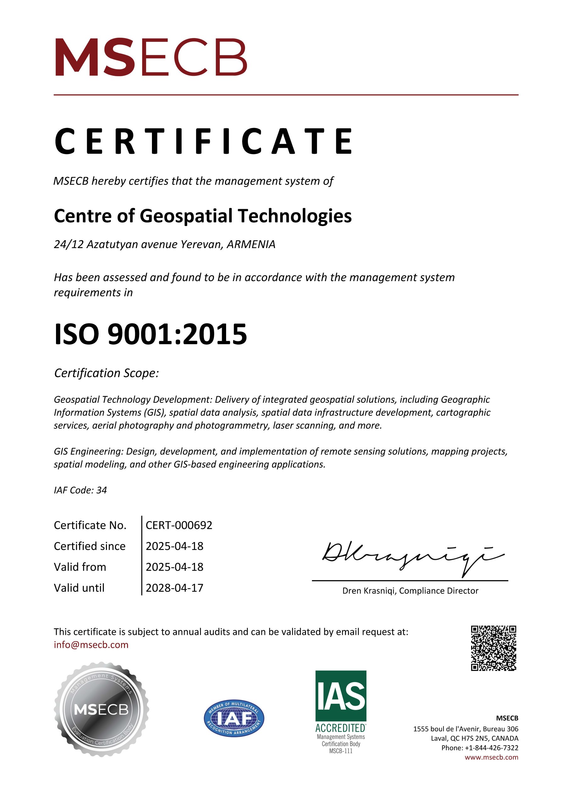 13 Apr Center of Geospatial Technologies has successfully passed its annual audit and reaffirmed compliance with the ISO 9001:2015 standard.